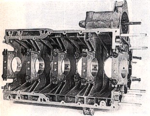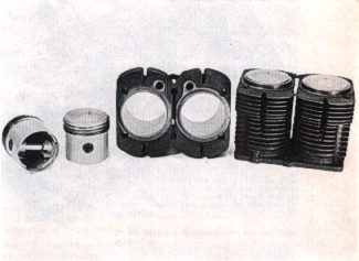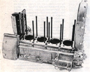 Keine Unterschiede zwischen den einzelnen Typen finden wir beim Kurbelgehäuse und alles mit ihm in Verbindung stehenden Teilen, wie Steuergehäuse, Lüftergehäuse, Ölwanne etc. mit Ausnahme der Zylinder. Das Kurbelgehäuse besteht aus einer Aluminiumlegierung und ist in Druckguss hergestellt. Besser als die ausführlichste Beschreibung, zeigt unser Foto die außergewöhnliche Sorgfalt, mit der die Konstrukteure hier allen möglichen Beanspruchungen - Belastungen seitens der Lagerung, Wärmeverzug etc. - entgegengearbeitet haben. Gegenüber Graugussblöcken sind Leichtmetallgehäuse ja ungleich problematischer, doch glauben wir nicht, dass sich das Auge im Falle dieses Kurbelgehäuses täuscht. Dafür spricht, das der NSU-Vierzylinder aus dem Kurbelgehäuse heraus als kerngesund gilt. Wenn man das Gehäuse von unten (innen) aus betrachtet, fällt sofort die doppelte Gabelung der Dichtungsfläche auf. Dazu folgendes: der Verlauf der inneren Fläche folgt der Kontur der Ölwanne, die äußere Fläche dient als Flansch - siehe unsere Beschreibung des Aufbaus vom gesamten Triebwerksblock - für das Getriebe/Differentialteil. Die fünffache Lagerung der Kurbelwelle in ihren Lagerböcken erkennt man ebenfalls sehr deutlich. Die Lagerabstände betragen: 91; 95; 95; 91 mm. | |